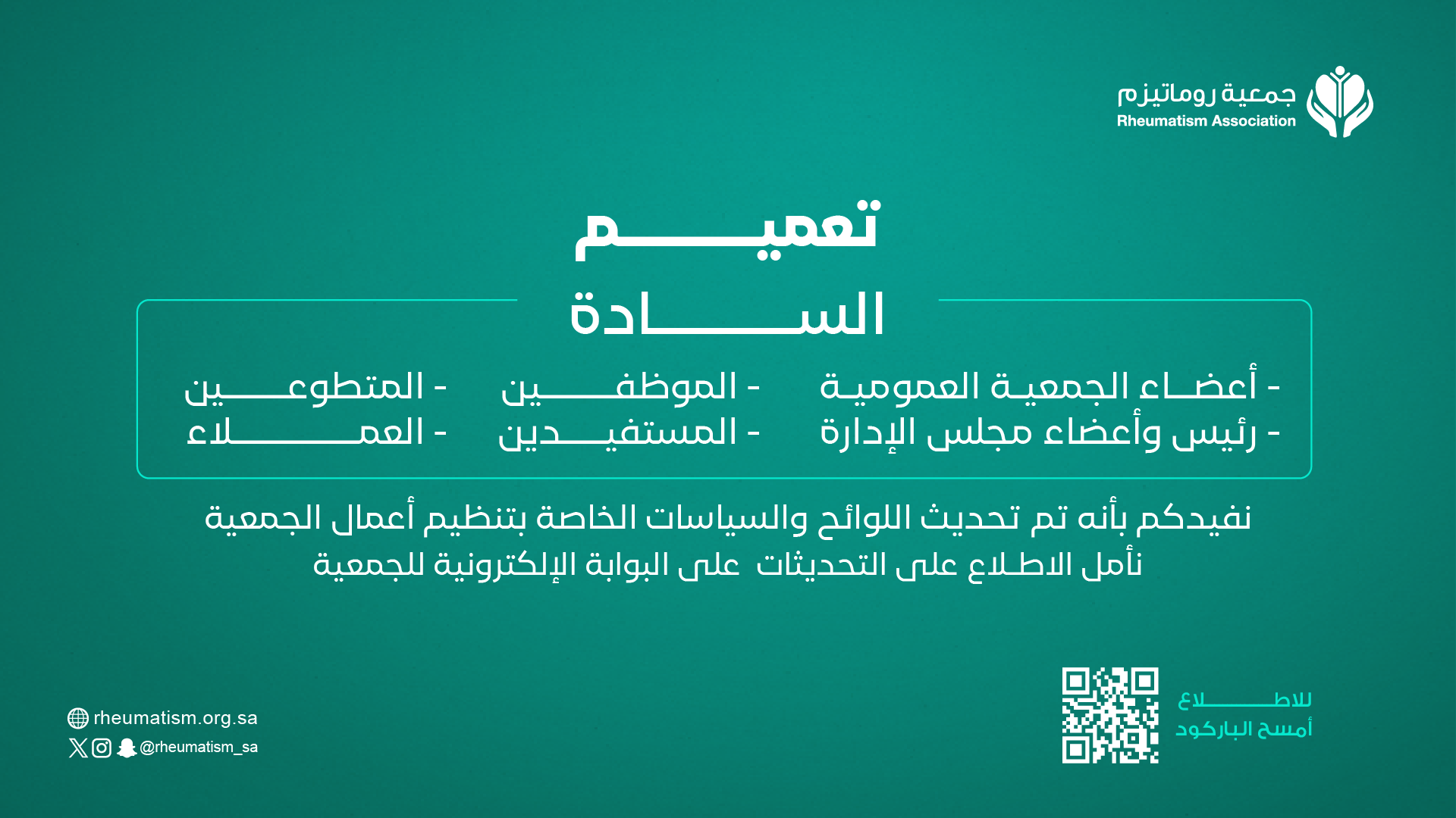 السادة / ✅ أعضاء الجمعية العمومية ✅ رئيس وأعضاء مجلس الإدارة ✅ الموظفين ✅ المستفيدين ✅ المتطوعين ✅ العملاء نفيدكم يأنه تم تحديث اللوائح والسياسات