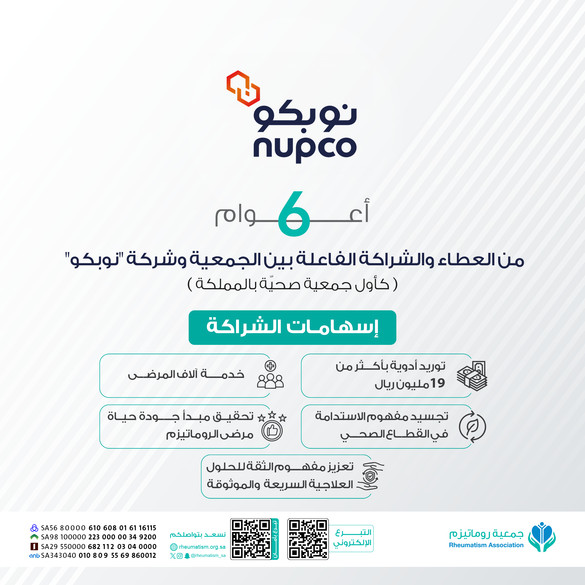 ترعى الجمعية الجوانب الطبية والعلاجية والنفسية للمرضى الأشد احتياجاً (كبار - أطفال)، وتساهم في نشر التوعية والتثقيف بهدف تقليص الأثر السلبي للأمراض الروماتيزمية على الأفراد المصابين بها وأسرهم والمجتمع.