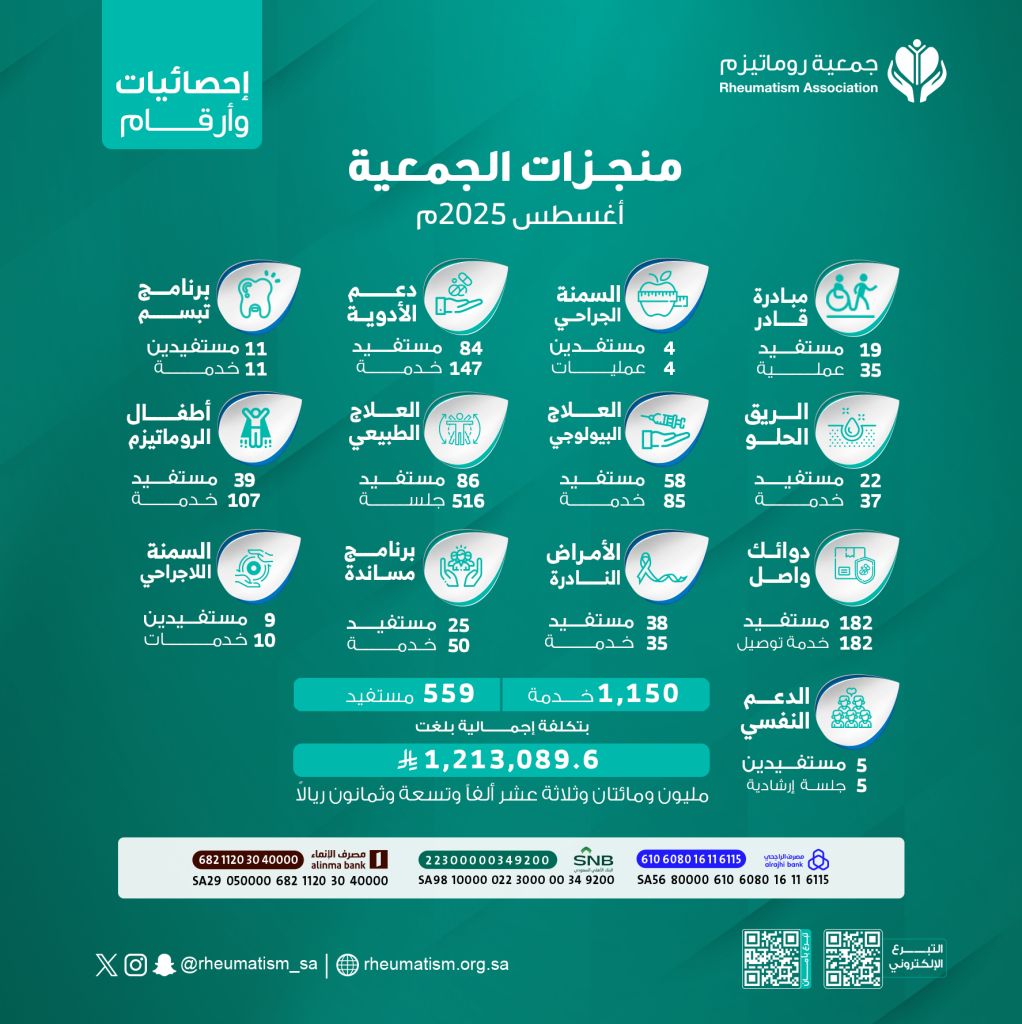 ترعى الجمعية الجوانب الطبية والعلاجية والنفسية للمرضى الأشد احتياجاً (كبار - أطفال)، وتساهم في نشر التوعية والتثقيف بهدف تقليص الأثر السلبي للأمراض الروماتيزمية على الأفراد المصابين بها وأسرهم والمجتمع.