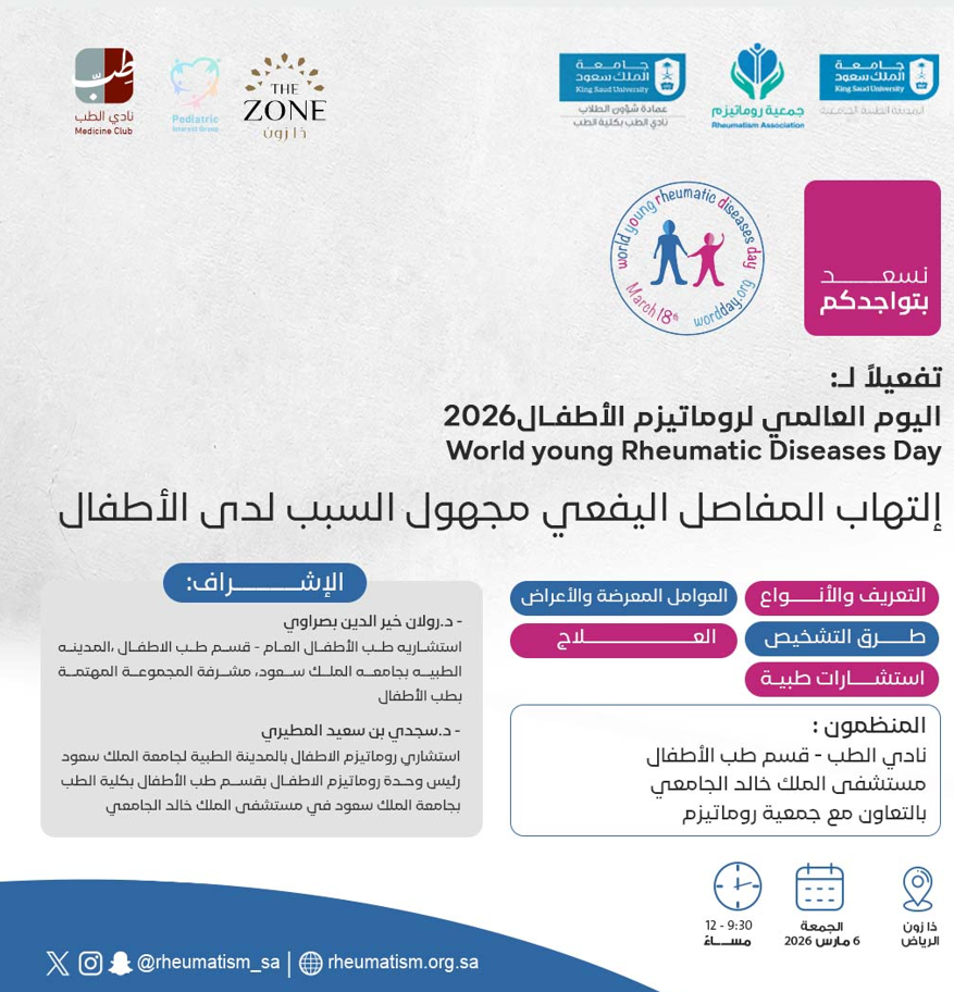 | تفعيلاً لـ #اليوم_العالمي_لروماتيزم_الأطفال 2026م ينظّم نادي الطب – قسم طب الأطفال بالمدينة الطبّية الجامعية بجامعة الملك سعود